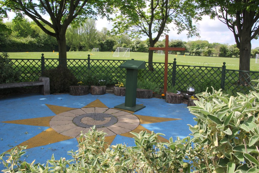 The natural stone of the Sun and Fish mosaic suggest silence and strength, whilst the wooden features and trees provide a sense of warmth and shelter.